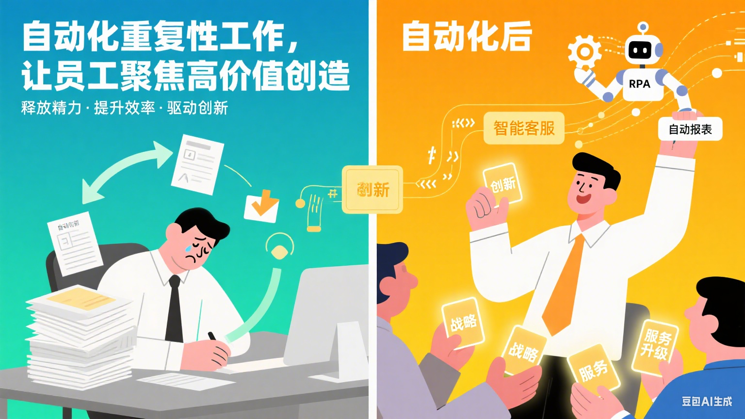 本文探讨企业通过自动化技术解决重复性工作问题,指出行政部门文件整理、财务发票录入、客服常见问题回复等重复性工作消耗员工精力、易出错且限制创新。自动化可释放人力、提升效率与质量,促进高价值创造。具体措施包括梳理可自动化流程、选择RPA等工具、系统集成测试及员工培训。实施后将提升企业运营效率与竞争力,改善工作氛围,推动员工聚焦创新发展。
